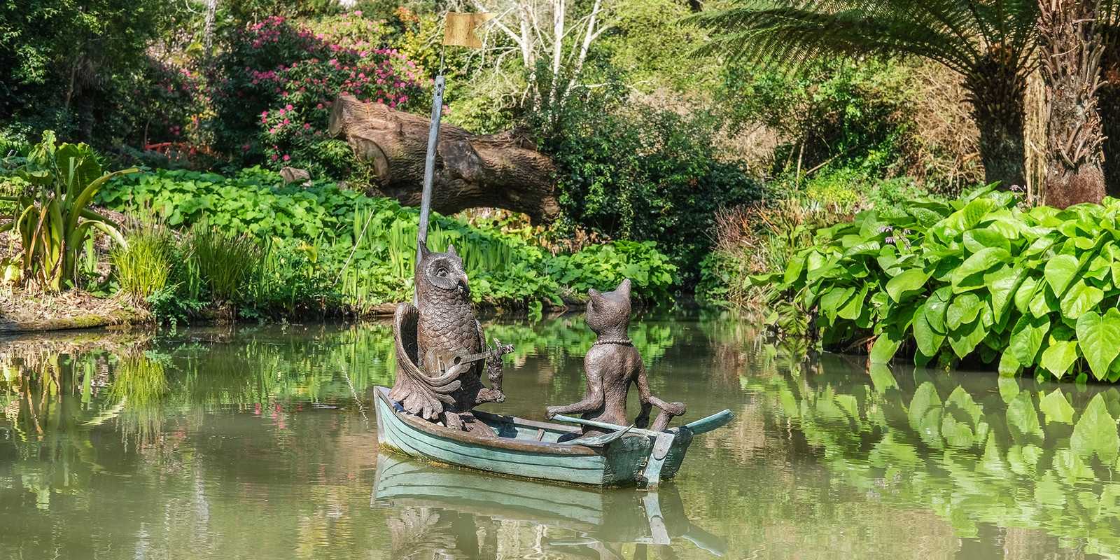 Bronze Owl and the Pussy-cat water feature handmade in the UK, inspired by the classic Edward Lear poem of 1871. The beloved work of literary nonsense is captured memorably in this hot cast bronze garden water sculpture.