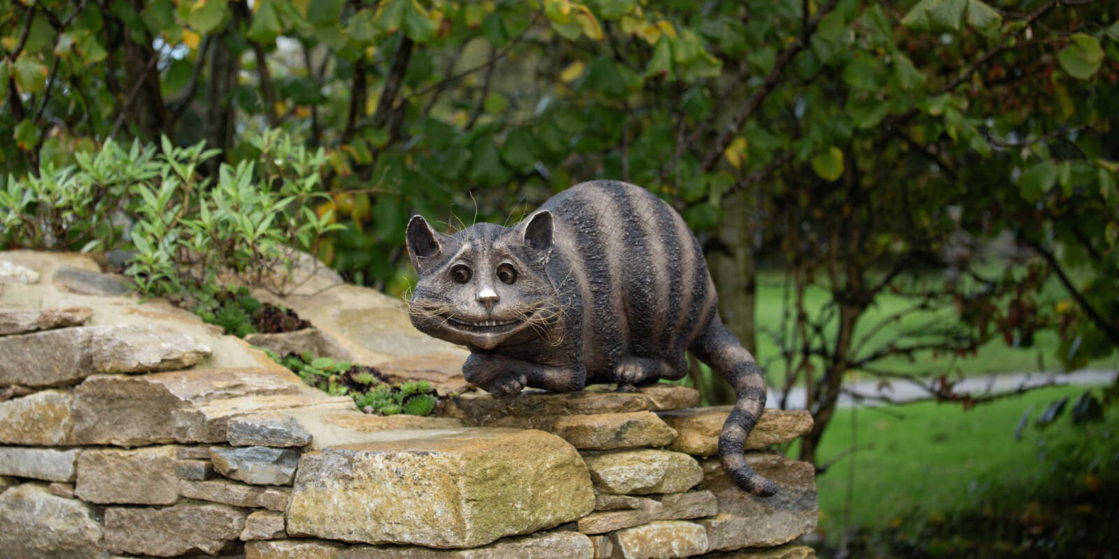 A handmade Cheshire Cat literary garden sculpture from Lewis Carroll's novel, Alice's Adventures in Wonderland. A large bronze ornament that will bring a sense of magic to your outdoor space. Available on hot cast bronze and cold cast bronze.