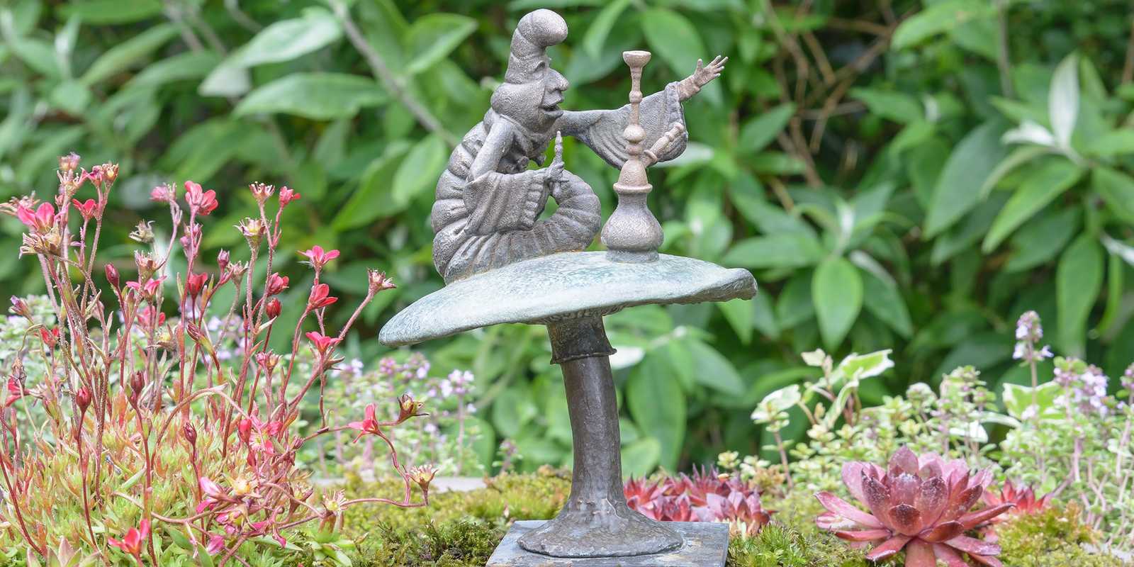 This beautiful Alice in Wonderland garden ornament, which captures The Caterpillar from Lewis Carroll's literary classic, is available in hot cast bronze. The miniature garden sculpture is perfect for both outdoor and indoor placement.