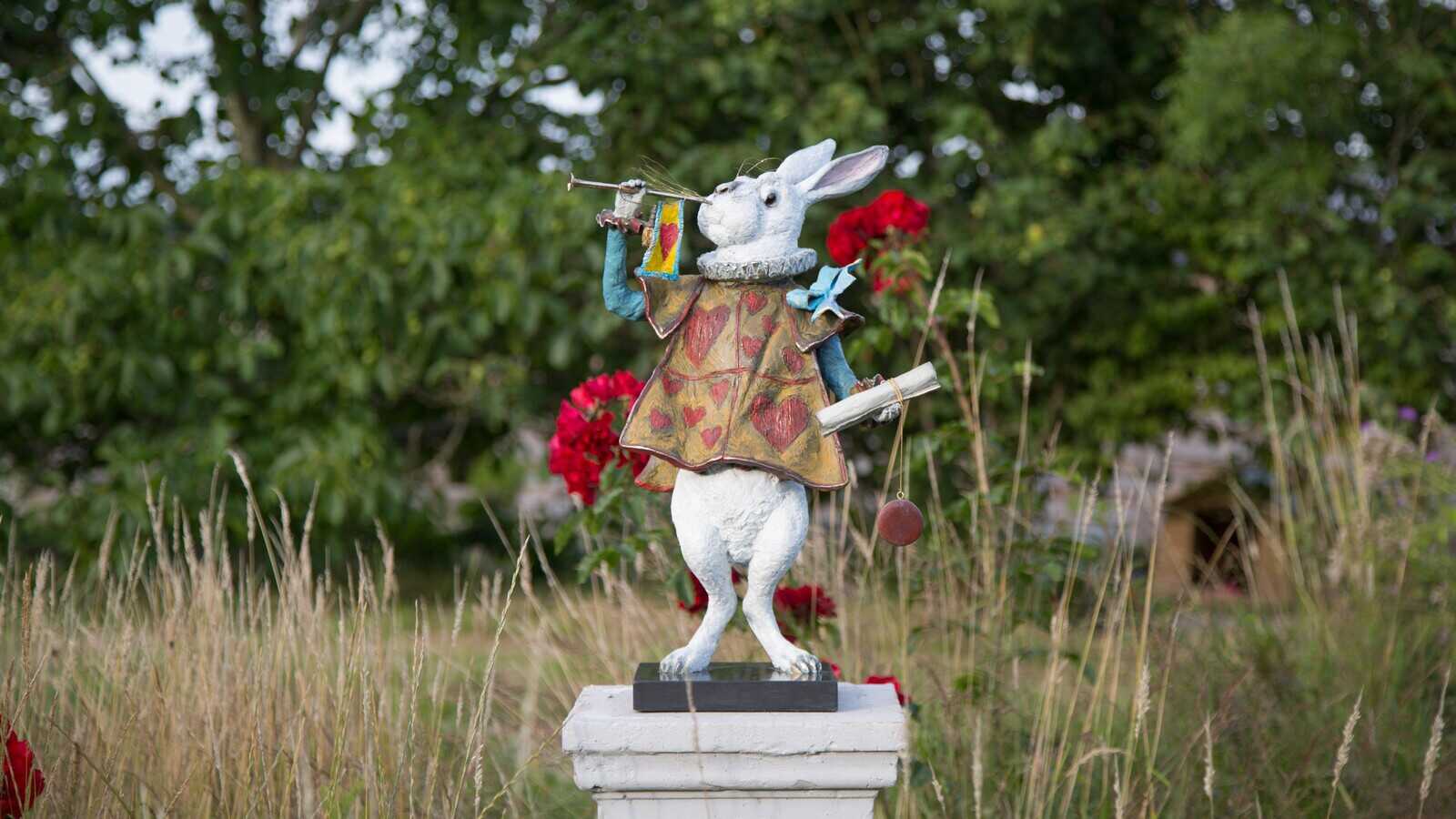 White Rabbit garden sculpture handmade in the UK using hot cast bronze. Regal Rabbit, from Alice’s Adventures in Wonderland, dressed in a courtier’s tabard, a stunning interpretation of Lewis Carroll’s famous creation.