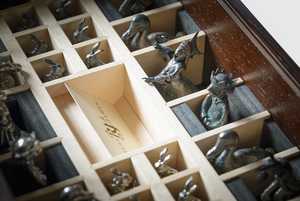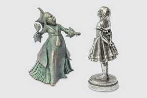 The 'light' characters are in natural pewter, accented with a dark wax, while the 'dark' characters have a bronzed effect with a verdigris finish.