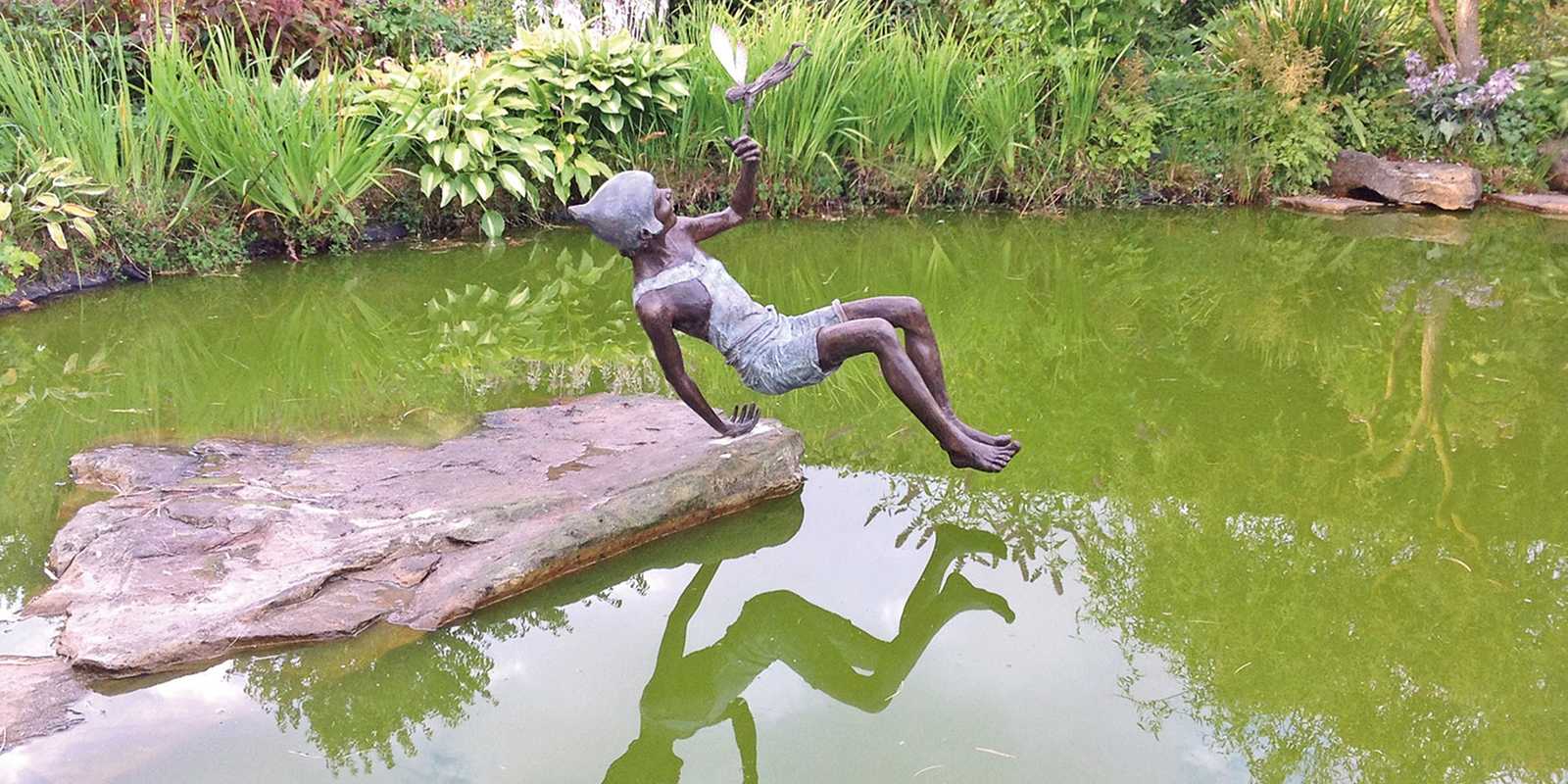 Peter Pan and Tinkerbell garden feature, made from hot cast bronze or cold cast bronze. A stunning handmade bronze sculpture inspired by J.M Barrie's classic book, Peter Pan. This stunning handmade outdoor statue is a must-have for classic children's literature fans.